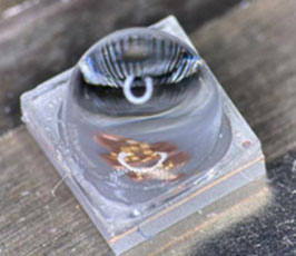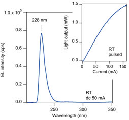 発光波長の短波長化に伴い、LEDの効率が指数関数的に低下することが知られています[2]。 特に、波長が230 nm以下のFar-UVC領域における効率は低く、実用化に求められる1 mWクラスの光出力の達成は極めて困難な課題でした。 当社は、世界に先駆けて1 mWの光出力を達成した理化学研究所のFar-UVC LEDに関する技術の社会実装を通じて、新しい光によるクリーンなソリューションの提供を目指しております。