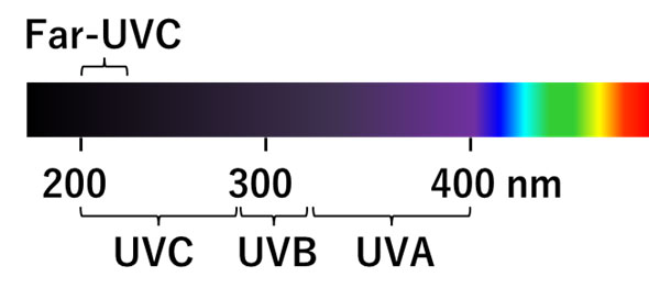 Far-UVCは、UVCの中でも、さらに波長の短い200 - 230 nmの特殊な光を指します。Far-UVCは、優れた殺菌効果を有すると同時に、人体に対する安全性が高いことも報告されている極めて有用性の高い光です。