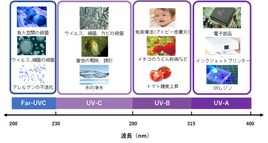 紫外光は、可視光線より波長が短い人間の目には見えない光です。この紫外光は、波長ごとにUVA、UVB、UVCと呼び分けられており、それぞれ優れた応用を有しております。