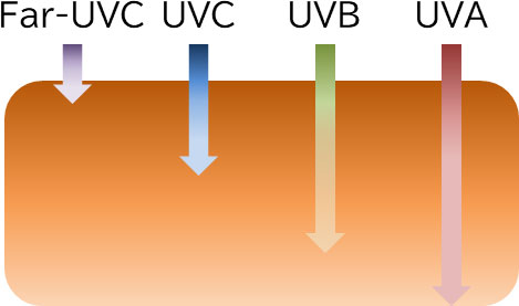 一般に、波長の短い光ほど物質に吸収されやすく、物質の内部に入り込む長さが短くなります。タンパク質に吸収されやすいFar-UVCは、死細胞から成る角質層で吸収されるため、生きている細胞に到達しません。そのため、人体に影響を及ぼすことなく、表面殺菌を可能にする新たな技術として大きな注目を集めております。
