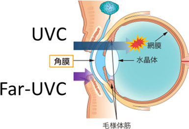 従来利用されてきたUVCは、生体に対する攻撃性が高いことから、無人環境での使用が前提でした。一方、Far-UVCは、人体に対する安全性が高く[2][3]、有人環境における利用についても議論が進められています。